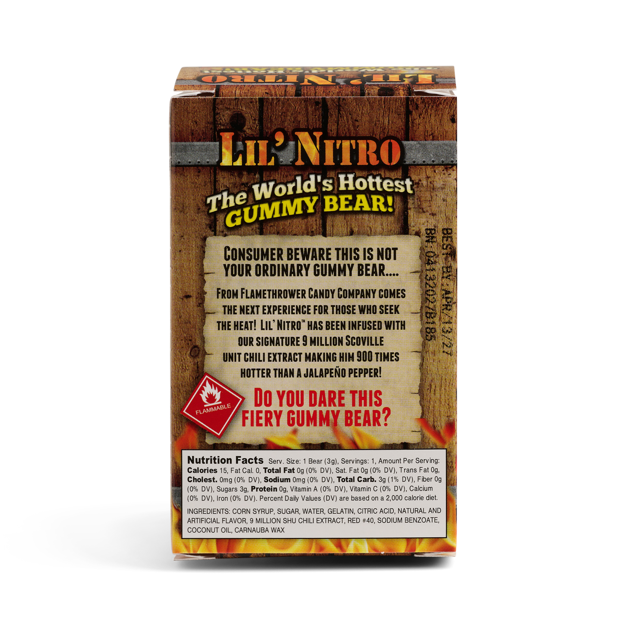CORN SYRUP, SUGAR, WATER, GELATIN, CITRIC ACID, NATURAL AND ARTIFICIAL FLAVOR, 9 MILLION SHU CHILI EXTRACT, RED #40, SODIUM BENZOATE, COCONUT OIL, CARNAUBA WAX