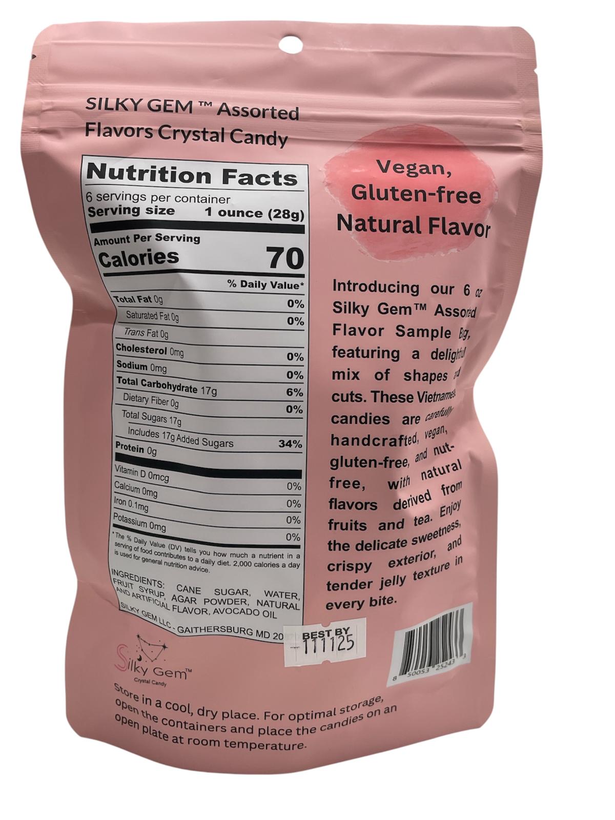 Introducing our 6 oz Silky Gem™ Assorted Flavor Sample Bag, featuring a delightful mix of shapes and cuts. These Vietnamese candies are carefully handcrafted, vegan, gluten-free, and nut-free, with natural flavors derived from fruits and tea.